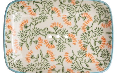 Keramik, glasiert und handbemalt, mit Löchern für den Wasserablauf, so liegt ihre Seife trocken