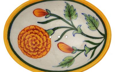 Keramik, glasiert und handbemalt, mit Löchern für den Wasserablauf, so liegt ihre Seife trocken