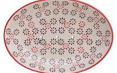 Keramik, glasiert und handbemalt, mit Löchern für den Wasserablauf, so liegt ihre Seife trocken